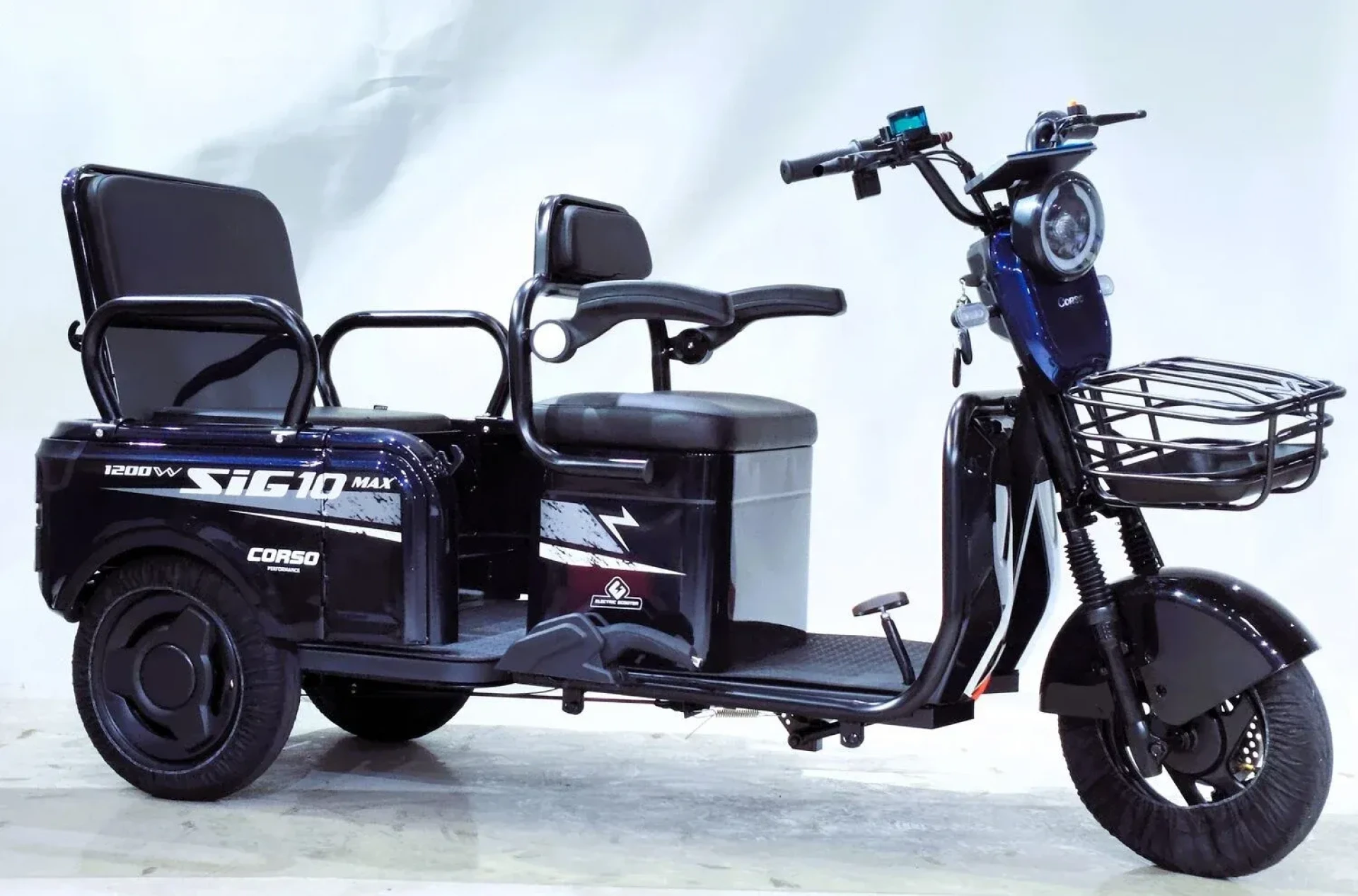 Электрический трицикл Corso «SIG-10 MAX» (двигатель 1200W, аккумулятор графеновый 72V/36Ah, колеса 300-10)