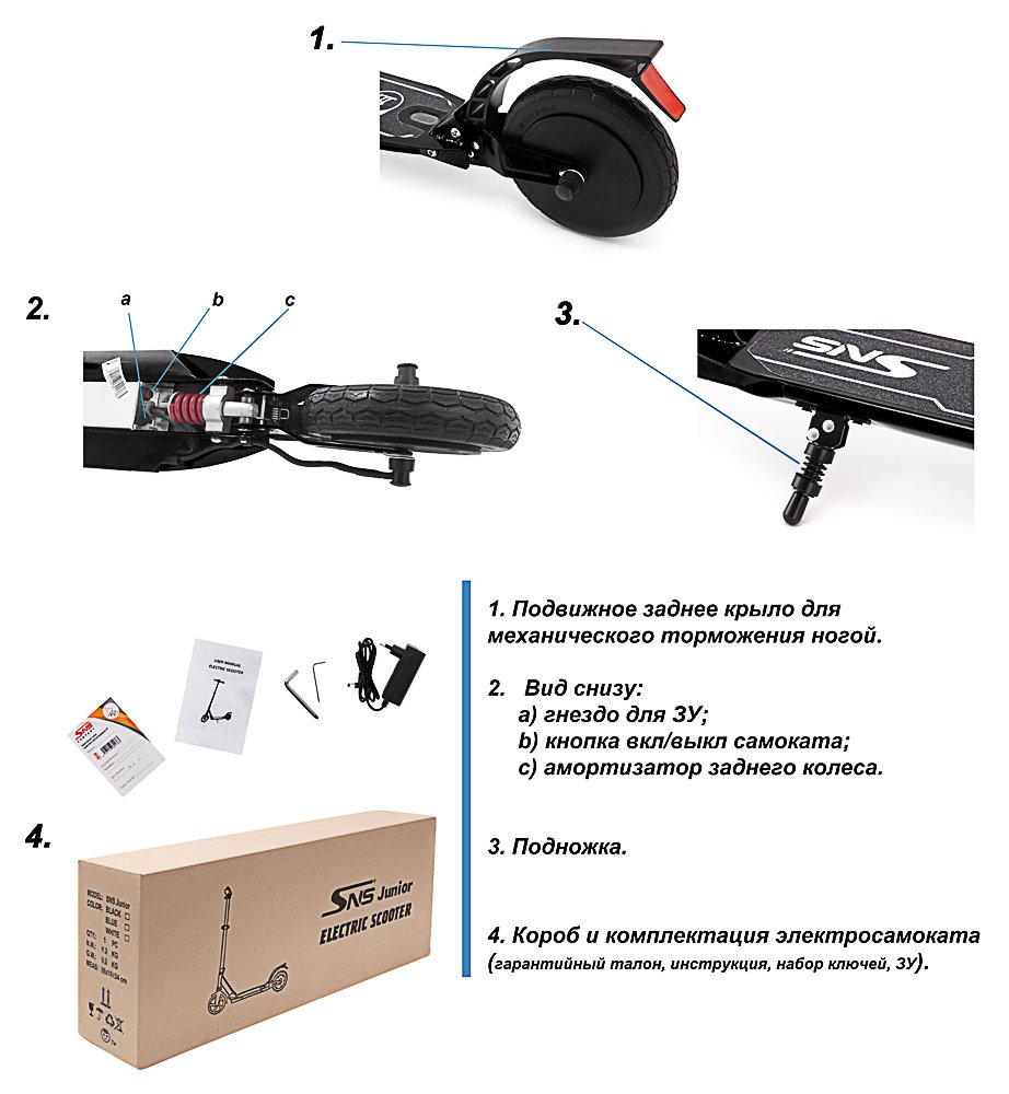 Вес модели составляет 8 кг. Ребенок вполне может поднять его самостоятельно. Это позволяет ему выйти на прогулку без помощи взрослых и без усилий внести/вынести самокат из лифта, подъезда, двора. Корпус самоката полностью металлический, это относится и к рулевой стойке, и к платформе для ног (деке). Вилка заднего ведущего колеса также металлическая и соединяет противень и ось колеса через пружинный амортизатор. Производитель рекомендует максимально допустимую нагрузку на изделие до 70-90 кг. Длина самоката составляет 95 см. Это почти на 15 см меньше чем у популярной модели Kugoo S3. Высота руля регулируется и в крайнем нижнем положении составляет 80 см. В сравнении противни 8 см. Это на 2 см ниже, чем у Kugoo и, практически, не отличается от обычного самоката. Это значит, что для юного водителя меньшие размеры изделия удобнее и для езды, и для транспортировки, и для переноски. Если не включать электросамокат, то высота деки позволяет его использовать как обычный самокат и двигаться отталкиваясь ногой от земли. тормоз. Для торможения достаточно нажать ногой на подвижное металлическое заднее крыло. Это позволяет использовать модель SNS-Юниор как обычный самокат. Кроме удобства, механическое тормоз служит для безопасности: вдруг произойдет аварийный разряд батареи, выйдут из стоя детали электрической части и пр. Необходима экстренная остановка. В этом случае механика никогда не подведет. Размер колес 8,0 дюймов( 20 см). Он соответствует полноценному самокату для взрослого человека. Чем больше колесо, тем комфортнее езда, мягче движение и меньше вибрация от неровностей покрытия. Мощность мотор-колеса 250Вт. Оба колеса с мягкими литыми резиновыми шинами, так что проколы и порезы не страшны. Емкость литий-ионной батареи 36V — 4,4Ач. Время полной зарядки 4-5 часов. Заявленные характеристики позволяют ребенку вагой 20-50 кг двигаться по ровному покрытию в течение времени со скоростью 15-18 км/ч. С такой скоростью бежит взрослый человек со средним уровнем спортивной подготовки. Для начала движения необходимо включить электросамокат и оттолкнуться ногой от земли, чтобы придать небольшую начальную скорость. При этом мотор-колесо начинает вращаться с постоянной скоростью. Замедлить движение или остановиться полностью можно нажать рычаг электротормоза большим пальцем левой руки либо использовать механическое тормоза. Такой способ начала движения создан, во-первых, для безопасности. Во-вторых, для экономии заряда батареи.