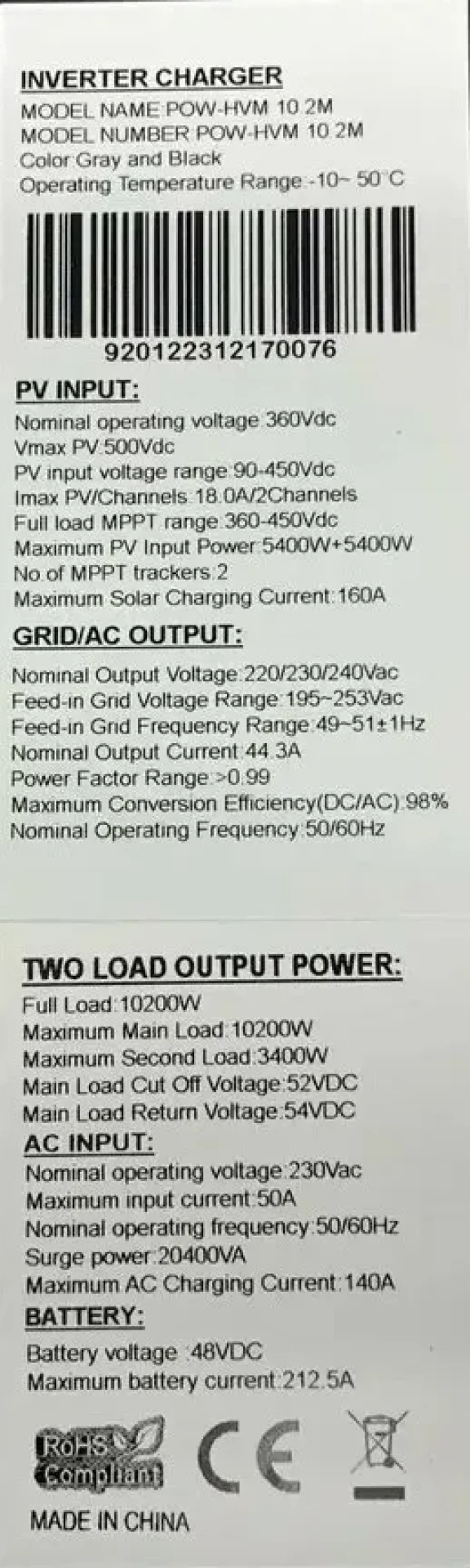 Гибридный инвертор солнечный PowMr 10200W 48V POW-HVM10.2M-48V (Max CH 160A, AC 140)